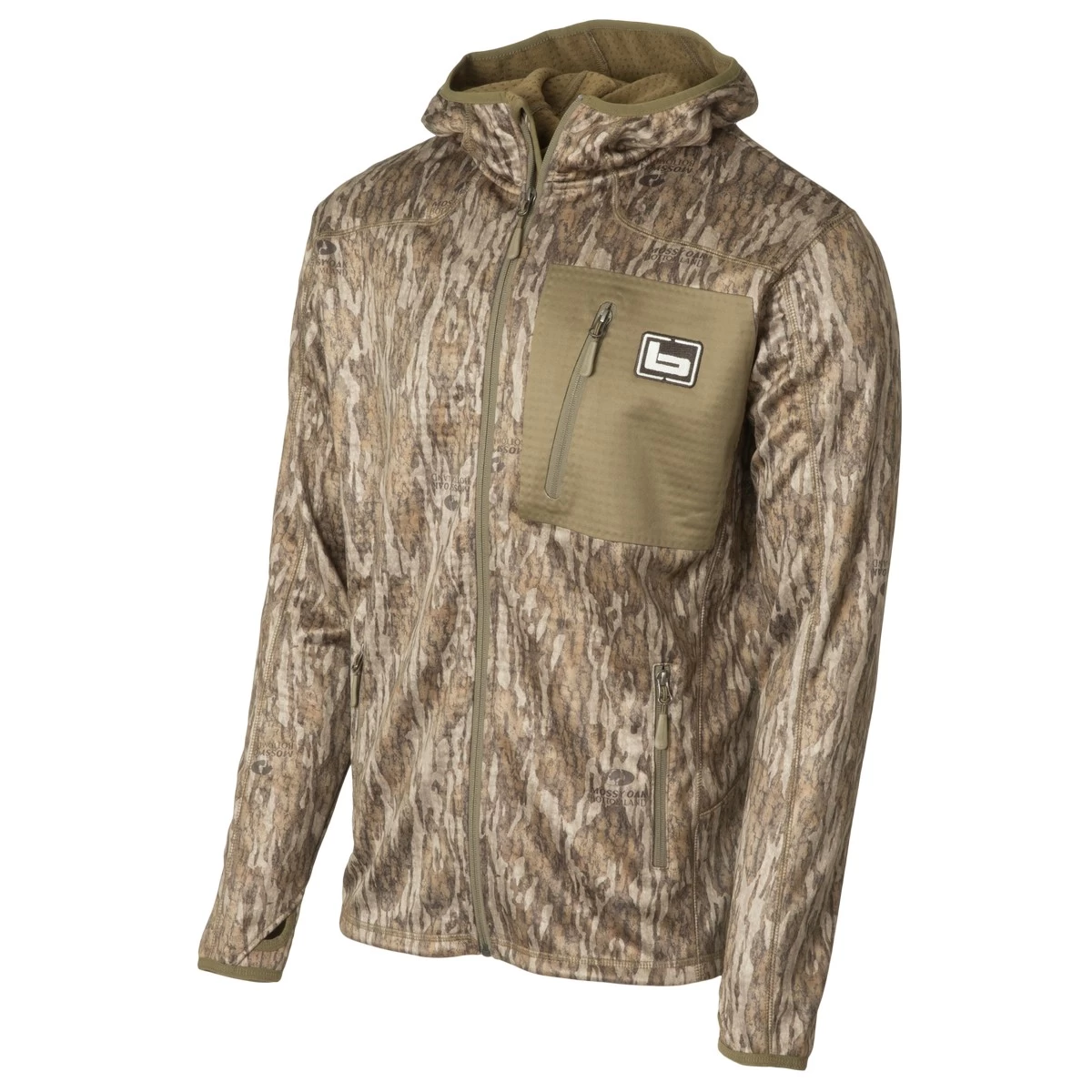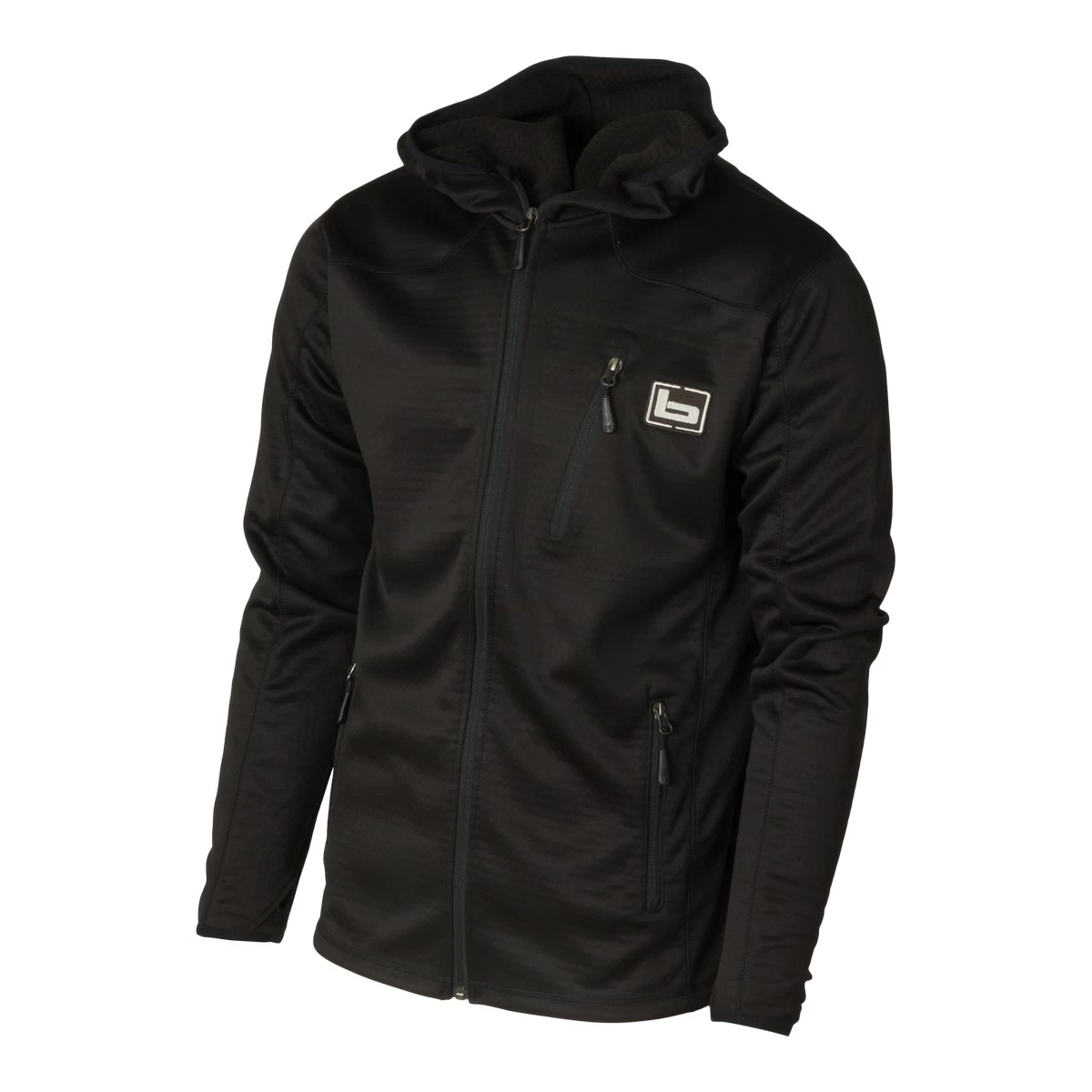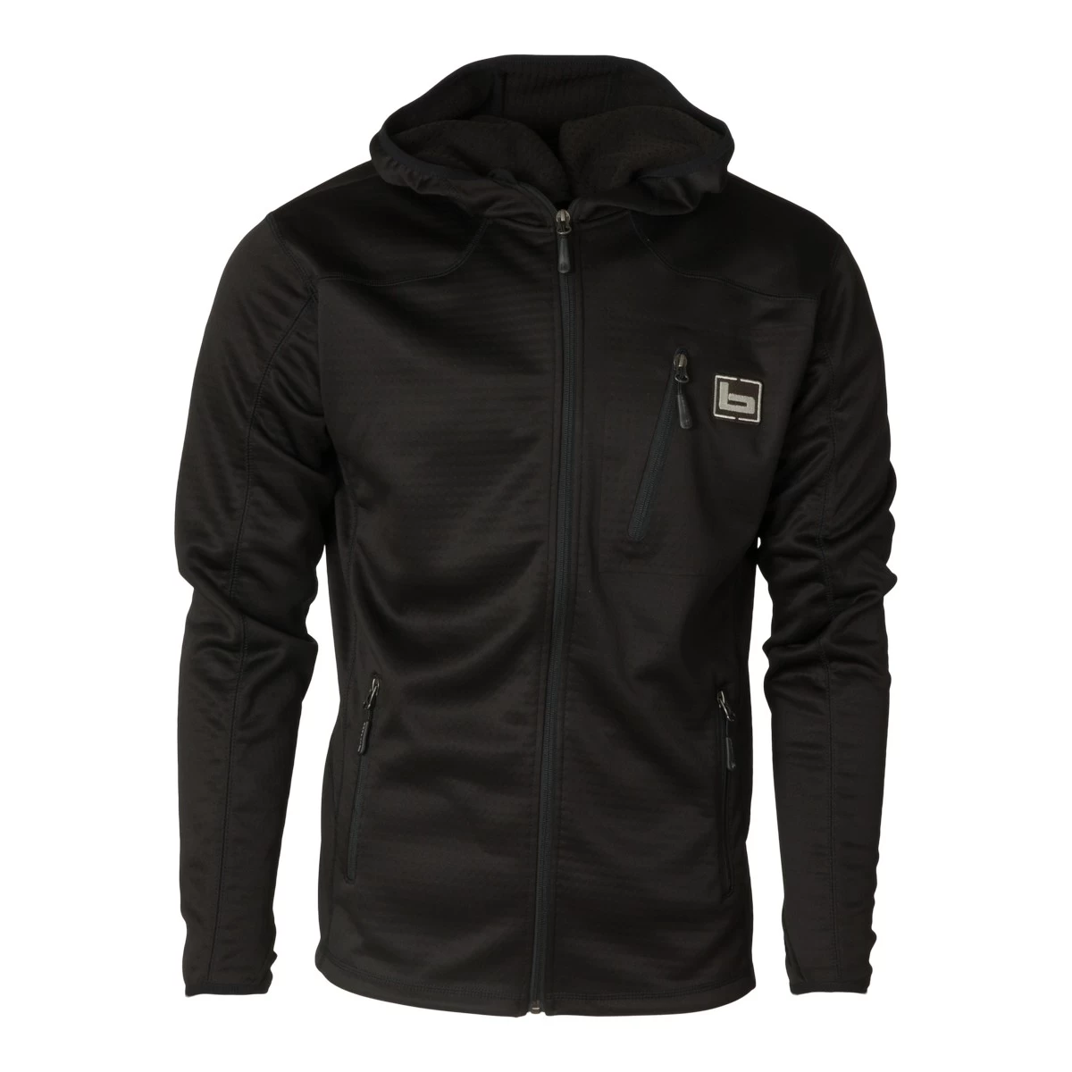 Banded Hooded Mid Layer Fleece JacketLightweight and warm, they are perfect for mild days with a chill in the air or use them in conjunction with a water and windproof outer layer such as the Banded Feather-Stretch Shell and you have a combination that keeps your warm & dry. Whether used as a layering piece of your system or primary protection, the Mid-Layer Hooded Jacket is a must have in your clothing arsenal. Key Features-Q.W.A.S.-Quiet wind and water-resistant soft-shell fabric handles many weather conditions -Brushed interior with warmth management grid-Zippered upper chest provides plenty of device storage-Hood for extra weather protection