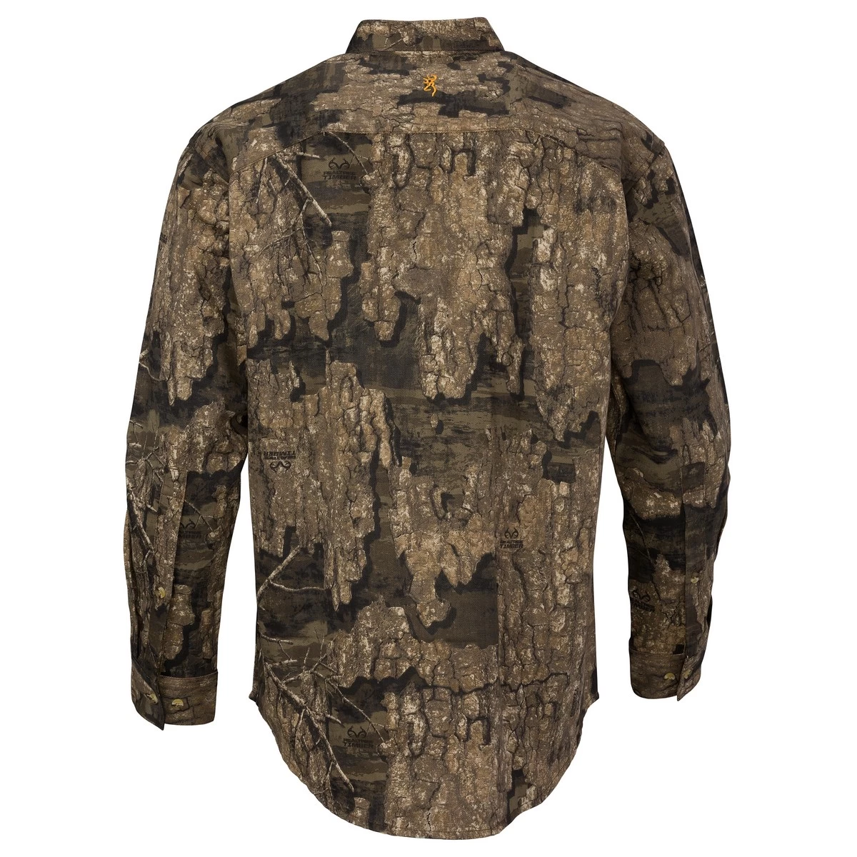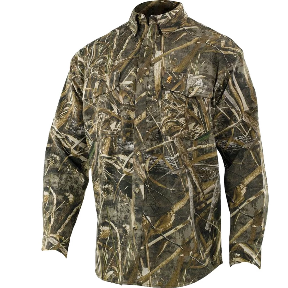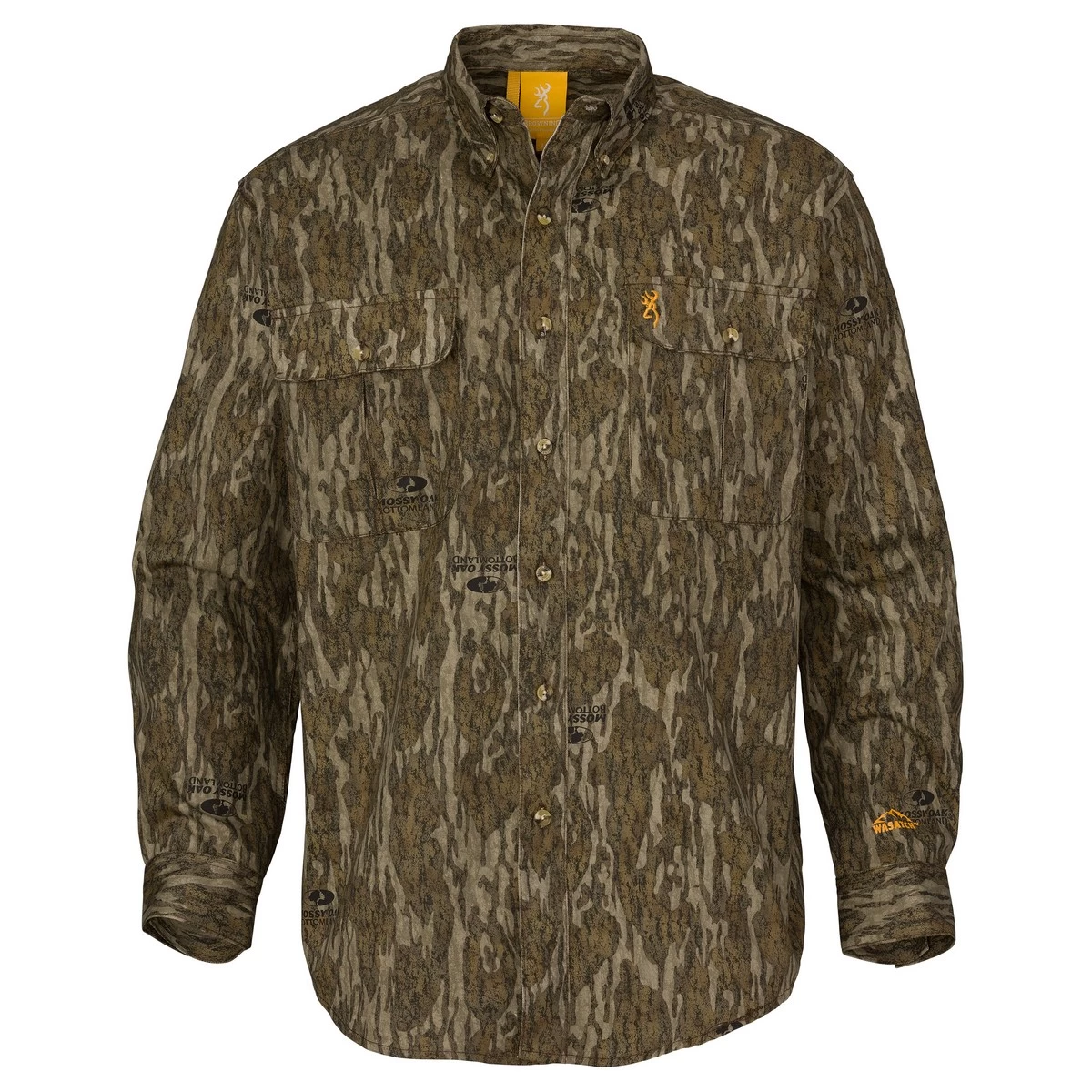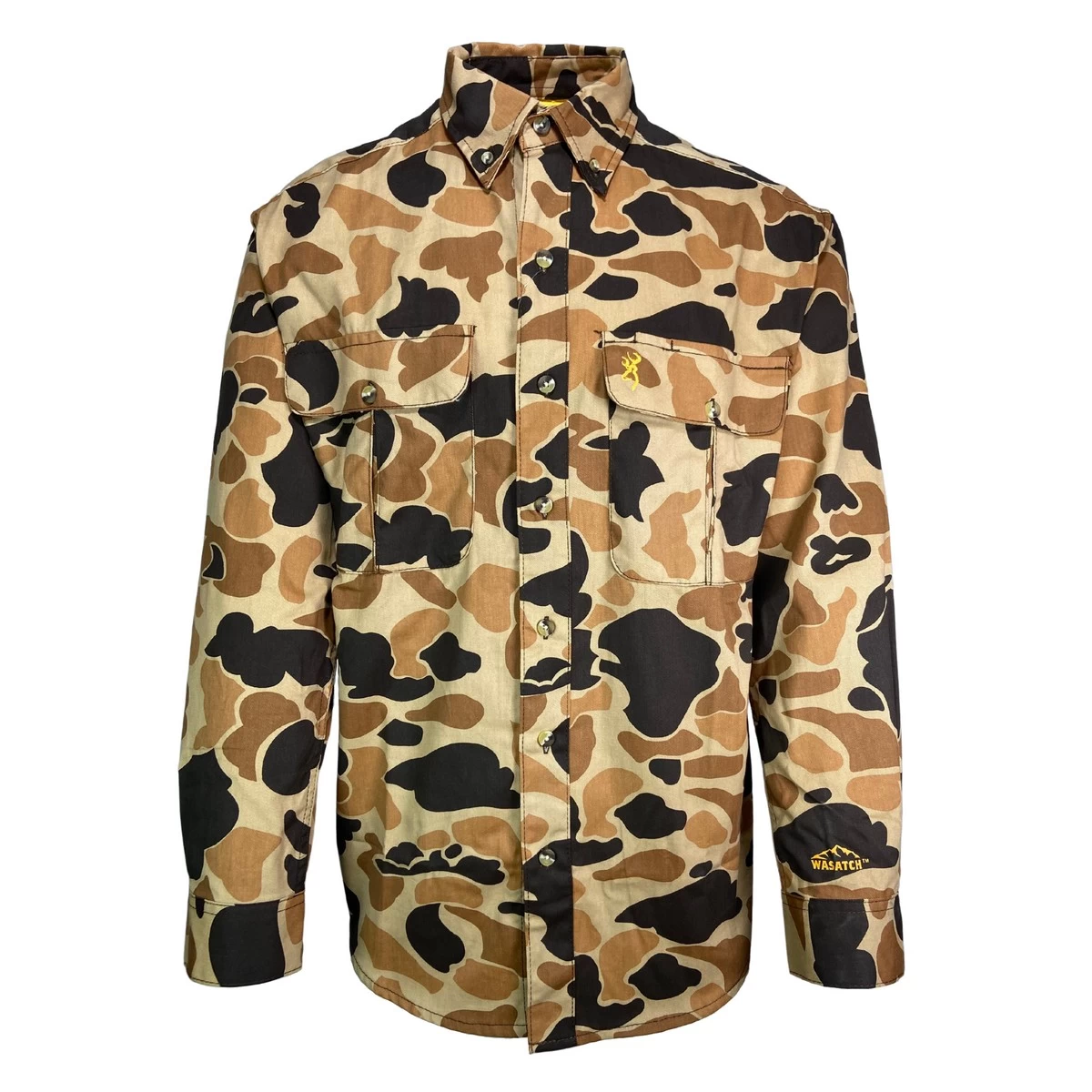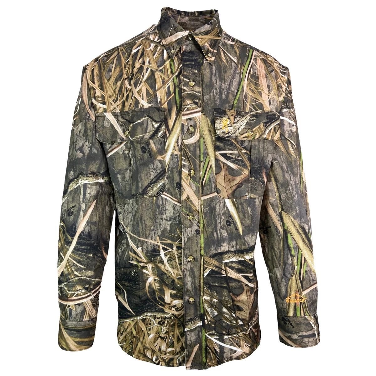 This Browning Wasatch-CB Button Up Long Sleeve Hunting Shirt is built to be long-lasting and comfortable. Made from comfortable lightweight cotton, the Wasatch-CB Shirt offers excellent camouflage concealment in hot to temperate weather. When it’s time to get messy, roll your sleeves up and get down to business. CB = Core and Basic. Not every hunting excursion requires gear rated for torrential rain, raging blizzards, or mercury plummeting below freezing temperatures. Core and Basic gear are perfect temperate weather when you’re focused more on being silent than being warm.Features and BenefitsLightweight 6 oz. cottonSeven-button front with long tailsDouble pleated back for full range of motionButton-down collarDouble-needle side seam constructionAdjustable button cuffs and longer sleeve plackets for easier roll-upRegular Fit