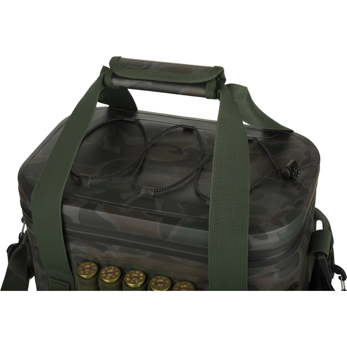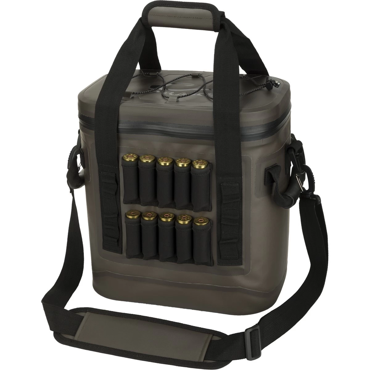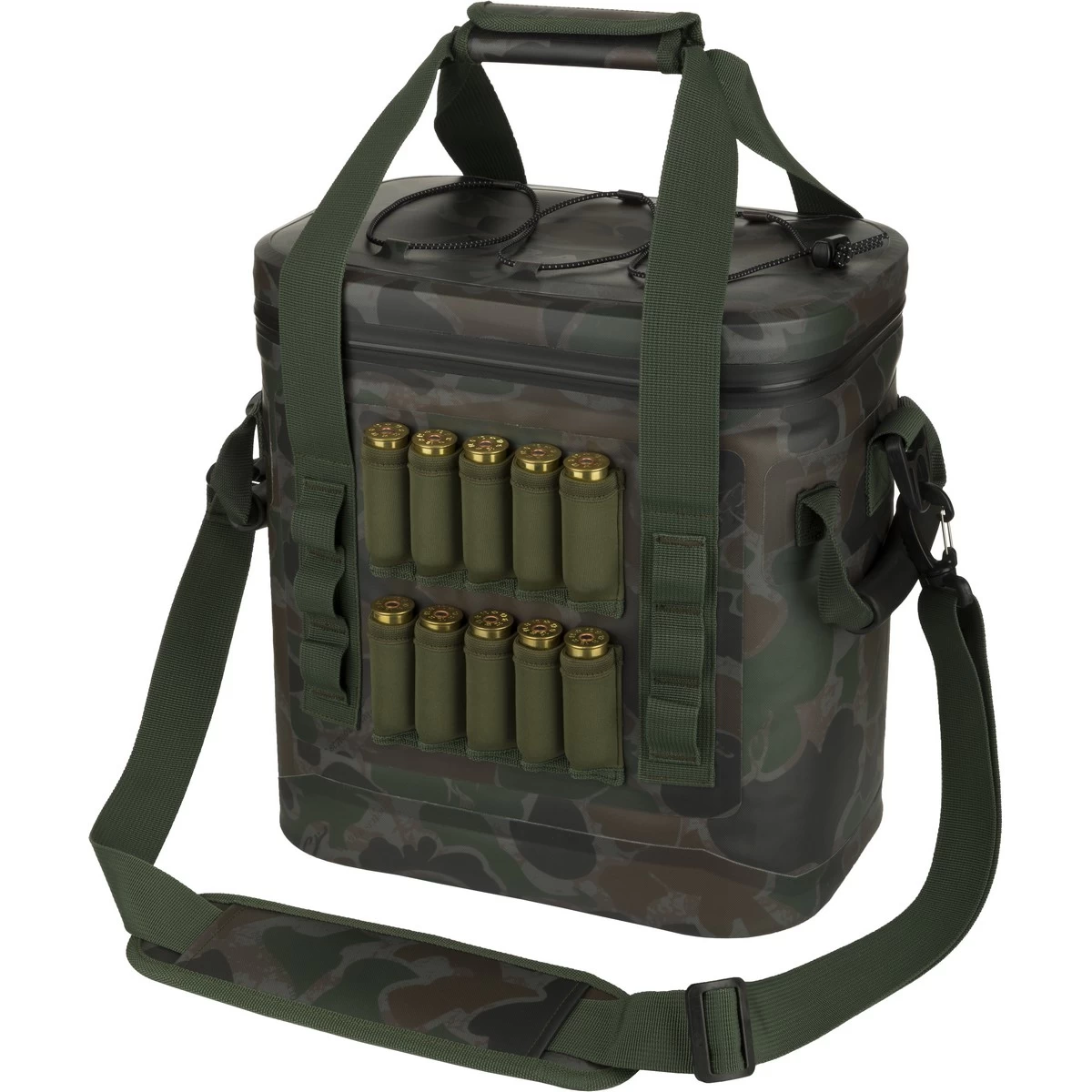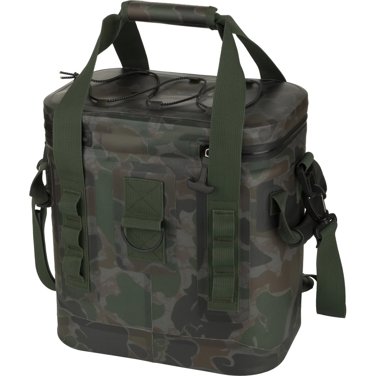 Drake 16-Can Waterproof Soft-Sided Insulated CoolerRugged, waterproof, and lightweight, the Drake 16-Can Soft-Sided Cooler will keep your food and drinks cold and protected. As the name suggests, it will easily hold 16, 12-ounce cans (ice included). Carrying it is easy and comfortable, thanks to the molded handles and padded shoulder strap. Molded feet help protect the bottom from abrasion and wear and the shock cord lashing strap with cord lock on the top allows you to pack a thermos, an extra layer, or rain jacket. It’s perfect for the hot weather of dove or early teal season and yet, for added functionality during the colder months, we added a metal D-ring to the back so that you can hang it in your pit, blind, or on a tree, while hunting flooded timber.MATERIALS:• Drake’s Drake’s Fowl-Proof™ YKK zippers• 600D TPU shell with 420D TPU linerNeoprene Shell Loops (10)• Molded handles• Padded shoulder strap with nylon webbing• Molded feet protect the cooler bottomFEATURES:• 16-can capacity (including ice)• Molle loops on front and back• Metal D-ring on back for hanging• Shock cord lashing strap with cord lock on top of lid
