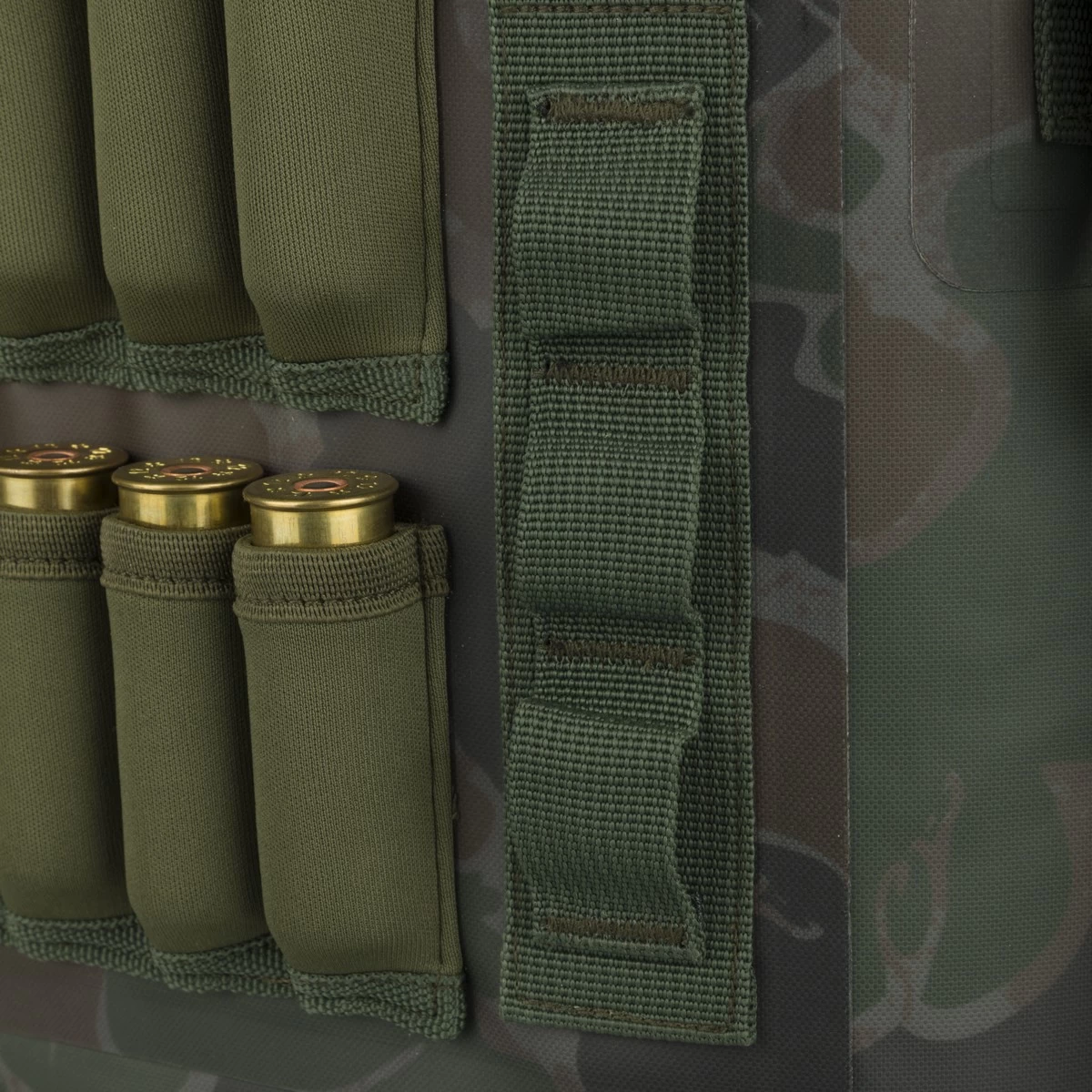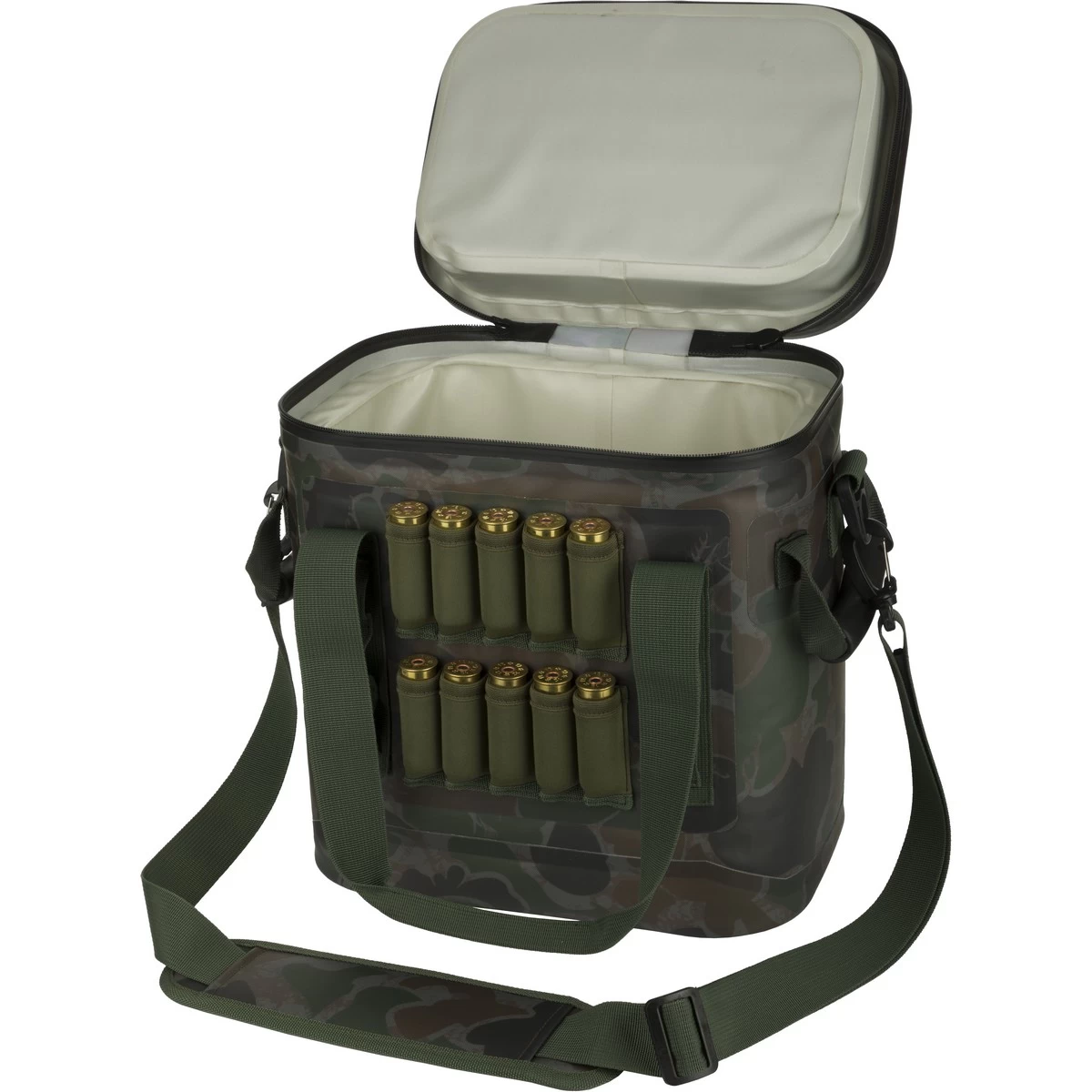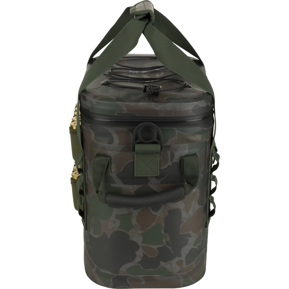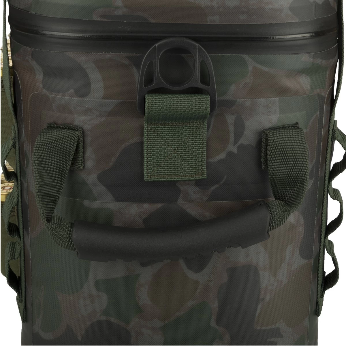 Drake 16-Can Waterproof Soft-Sided Insulated CoolerRugged, waterproof, and lightweight, the Drake 16-Can Soft-Sided Cooler will keep your food and drinks cold and protected. As the name suggests, it will easily hold 16, 12-ounce cans (ice included). Carrying it is easy and comfortable, thanks to the molded handles and padded shoulder strap. Molded feet help protect the bottom from abrasion and wear and the shock cord lashing strap with cord lock on the top allows you to pack a thermos, an extra layer, or rain jacket. It’s perfect for the hot weather of dove or early teal season and yet, for added functionality during the colder months, we added a metal D-ring to the back so that you can hang it in your pit, blind, or on a tree, while hunting flooded timber.MATERIALS:• Drake’s Drake’s Fowl-Proof™ YKK zippers• 600D TPU shell with 420D TPU linerNeoprene Shell Loops (10)• Molded handles• Padded shoulder strap with nylon webbing• Molded feet protect the cooler bottomFEATURES:• 16-can capacity (including ice)• Molle loops on front and back• Metal D-ring on back for hanging• Shock cord lashing strap with cord lock on top of lid