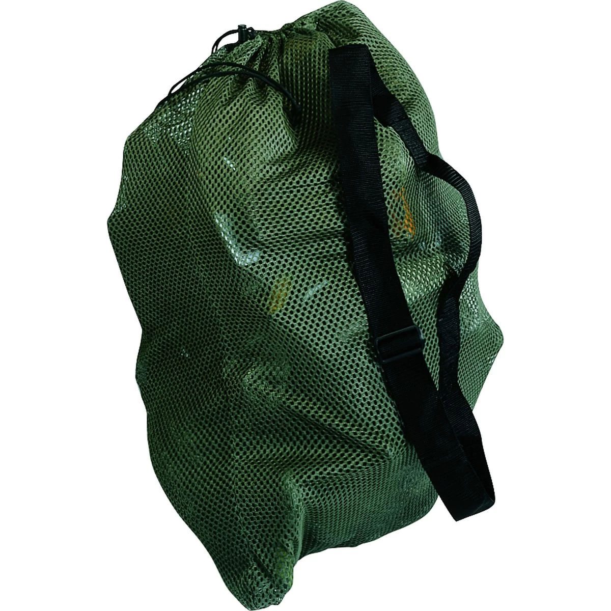 Drake Mesh Decoy Bag • Heavy-duty rot-proof polyester mesh • 2” polyester web shoulder straps • Draw string and barrel lock closure • Snag resistant