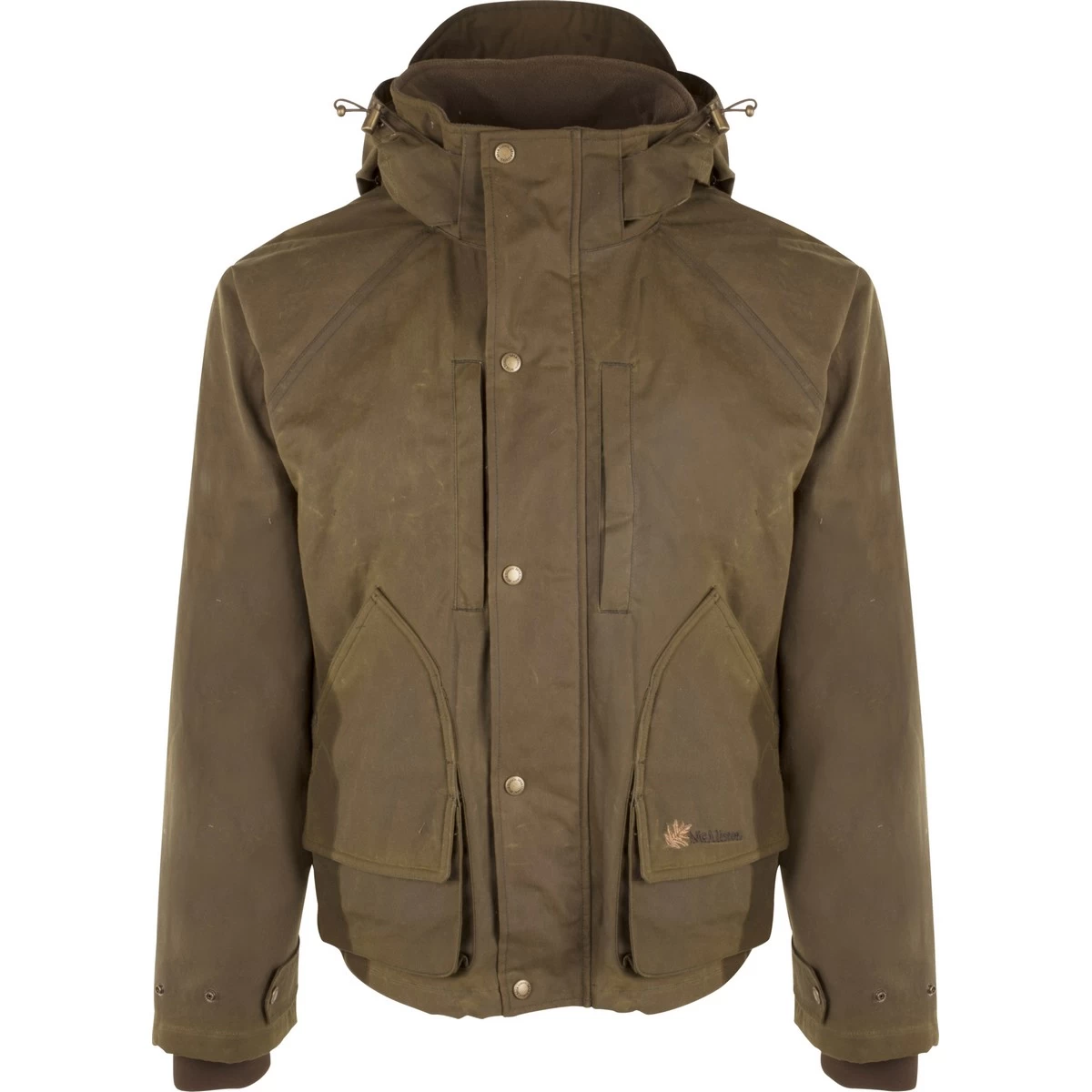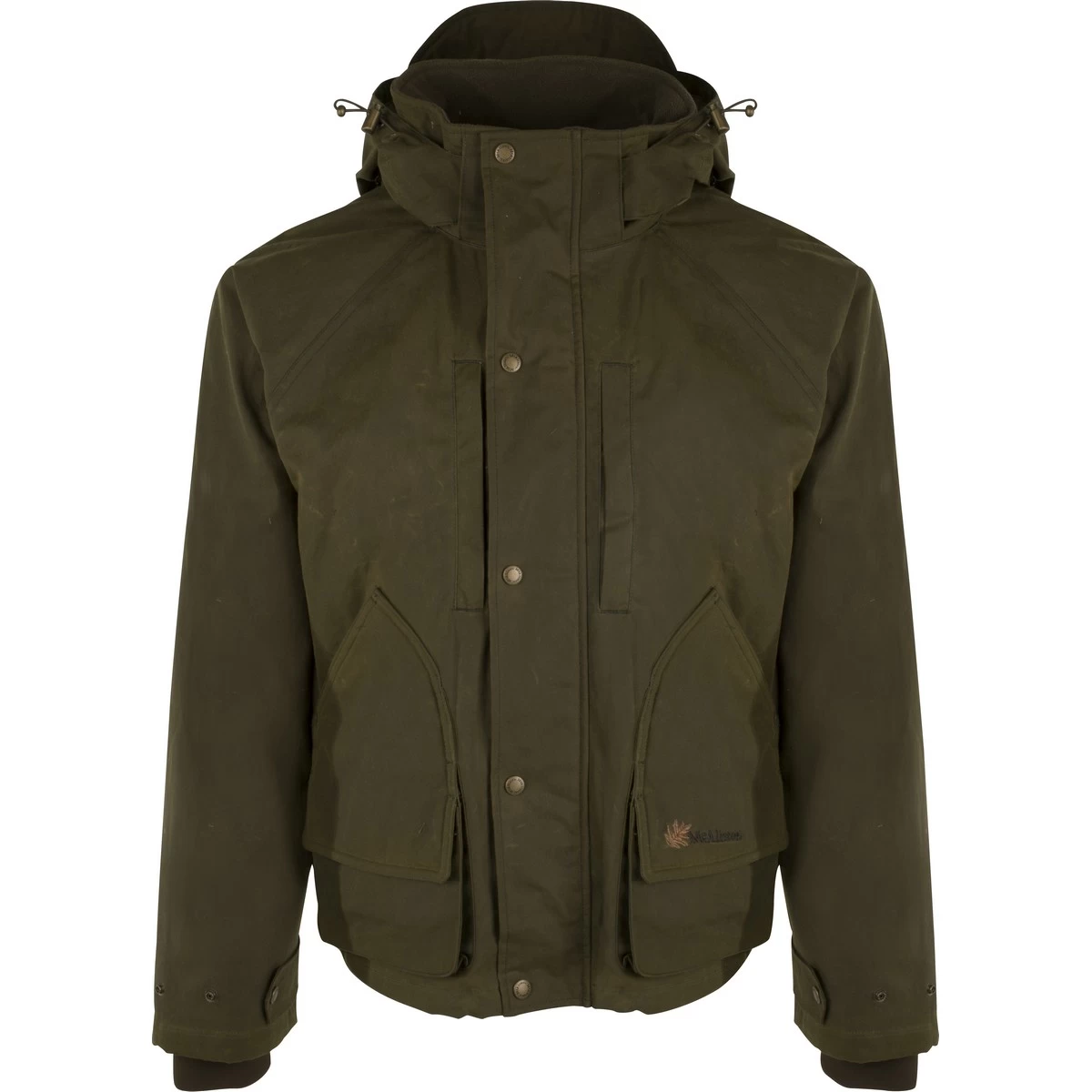 McAlister Wax Canvas Wading Jacket HELLO OLD FRIEND! These products are old faithfuls, they’ve stood the test of time and have been proven hard to beat. You can’t help but feel the rich tradition of waterfowl hunting when you pick them up. The traditional designs, classic good looks and quality materials will take you back to the good ol’ days when your great grandfather shot a limit of mallards over handcarved decoys with a single shot 12 gauge before his shift down at the mill.10.10 oz Wax Canvas 280 gram Fleece- Lined Collar Vertical Zippered Chest Pocket Magnattach® Chest Pocket Fleece-Lined Handwarmer Pockets Zip Closure Cargo Pockets Snap Closure Rear Cargo Pocket Neoprene CuffsZippered Detachable Hood
