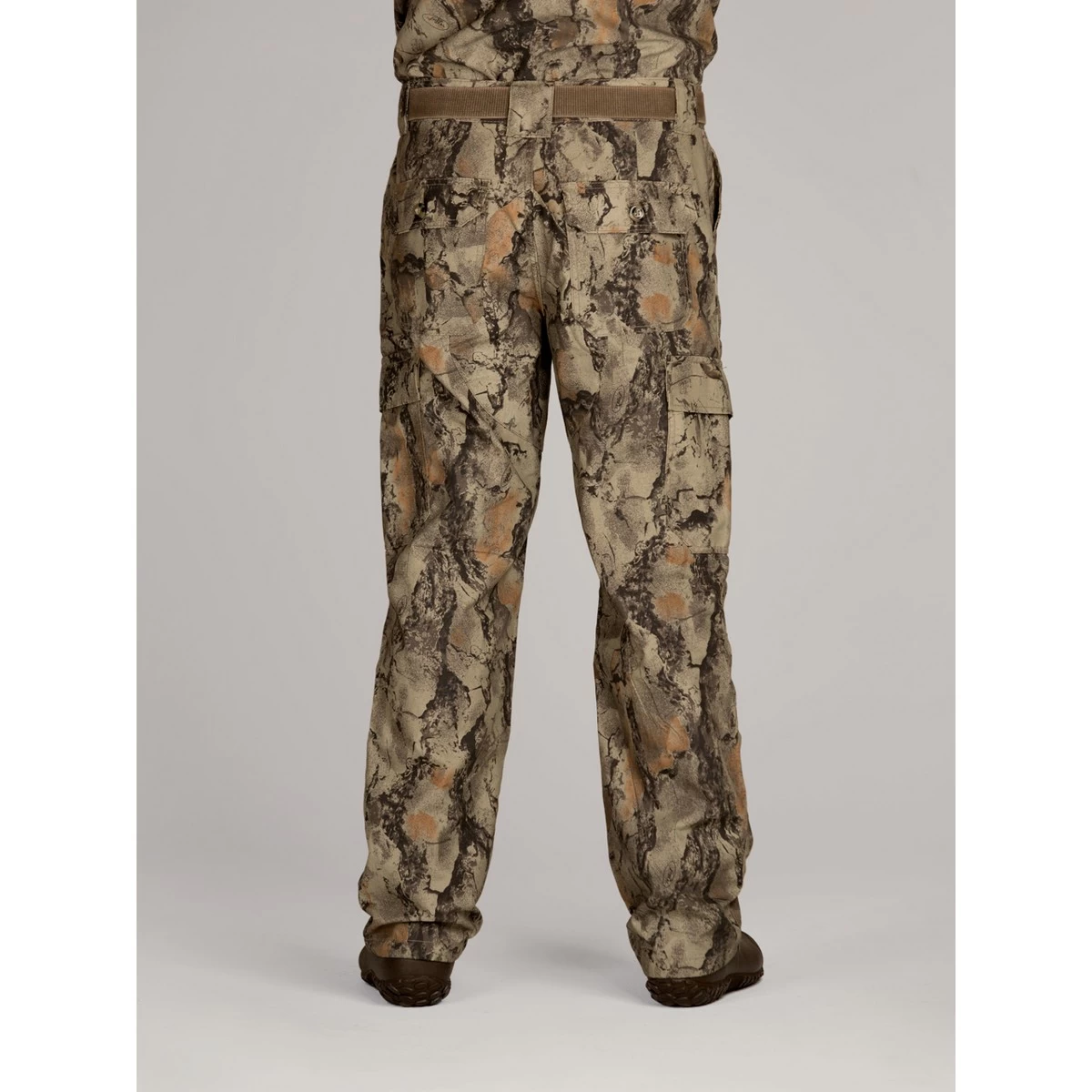 The Natural Gear 6 Pocket Tactical Fatigue pants are an essential camo hunting piece every hunter should own to round out a solid hunting wardrobe. These tactical camouflage hunting cargo pants are built tough with our rip-stop cotton/poly blend, guaranteed to get you through challenging terrain without major snags or tears and a functional six pocket design fully capable of holding all your hunting gear in the field. Coupled with breathability and lightweightness these camo fatigue pants will keep you mobile and help you stay on top of your game while remaining expertly hidden. Additional features include elastic inserts in the waist for custom fit, dual button cargo pockets, and cuff ties. Pair our natural pattern hunting fatigue pants with the Natural Gear Bush Shirt to complete your go-to camo hunting set-up. Cotton/Poly Rip-Stop Stretch Material 6 Pocket Design Lightweight Breathable Elastic Waist Inserts Enhance Fit Extra Wide Belt Loops Dual Button Cargo Pockets Cuff Ties Standard Inseam 32” Long 34” Full Cut