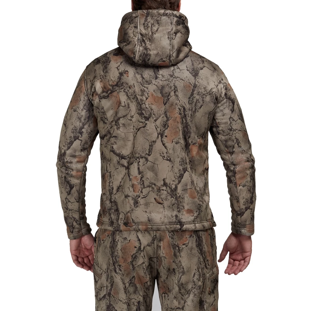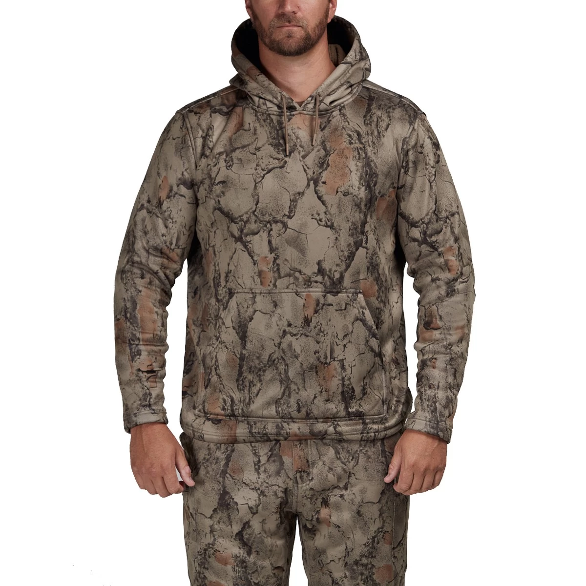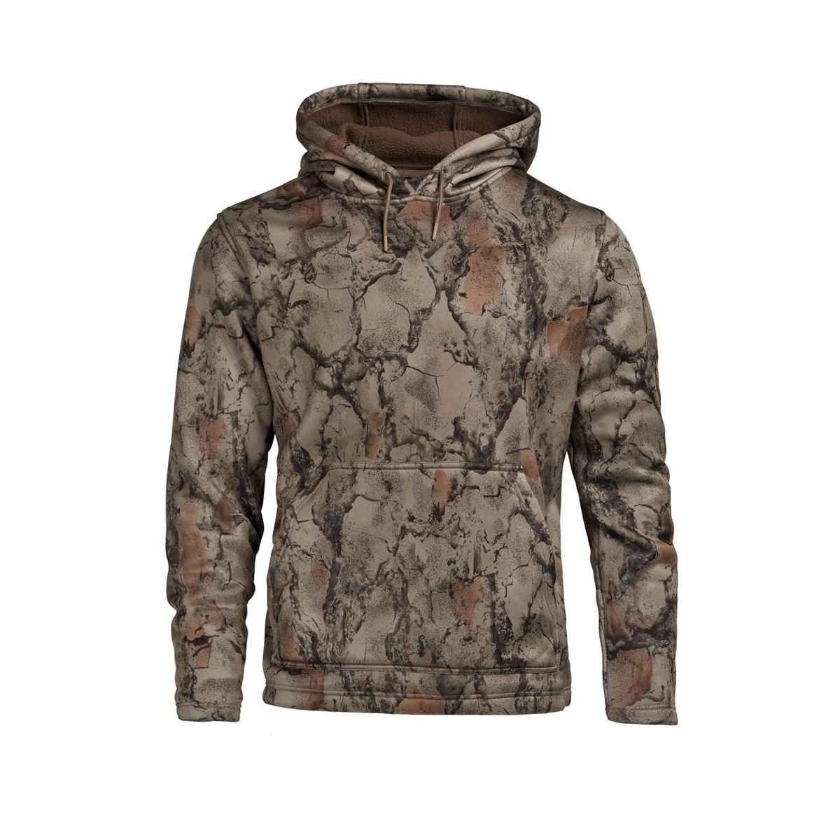 Natural Gear Mid Weight Layering HoodyThe Natural Gear Soft Shell Mid-Weight Layering hoodie is what you need as a stand alone on mild days and as a layering piece under your jacket when its colder. This hunting hoodie is built from a soft shell polyester with integrated stretch for comfort and ease of movement. Lined with a soft fleece for additional warmth and equipped with kangaroo pouch and drawstring hood for perfect functionality. Soft and quiet for the deer stand and warm and comfortable for the duck blind, check out the rest of the soft shell mid-weight line for the perfect layering system. Soft Shell Stretch Poly Shell Fuzzy Fleece Lining Pass Through Kangaroo Pouch Drawstring Hood Tapered Cuffs Draw cord Waist True-Cut