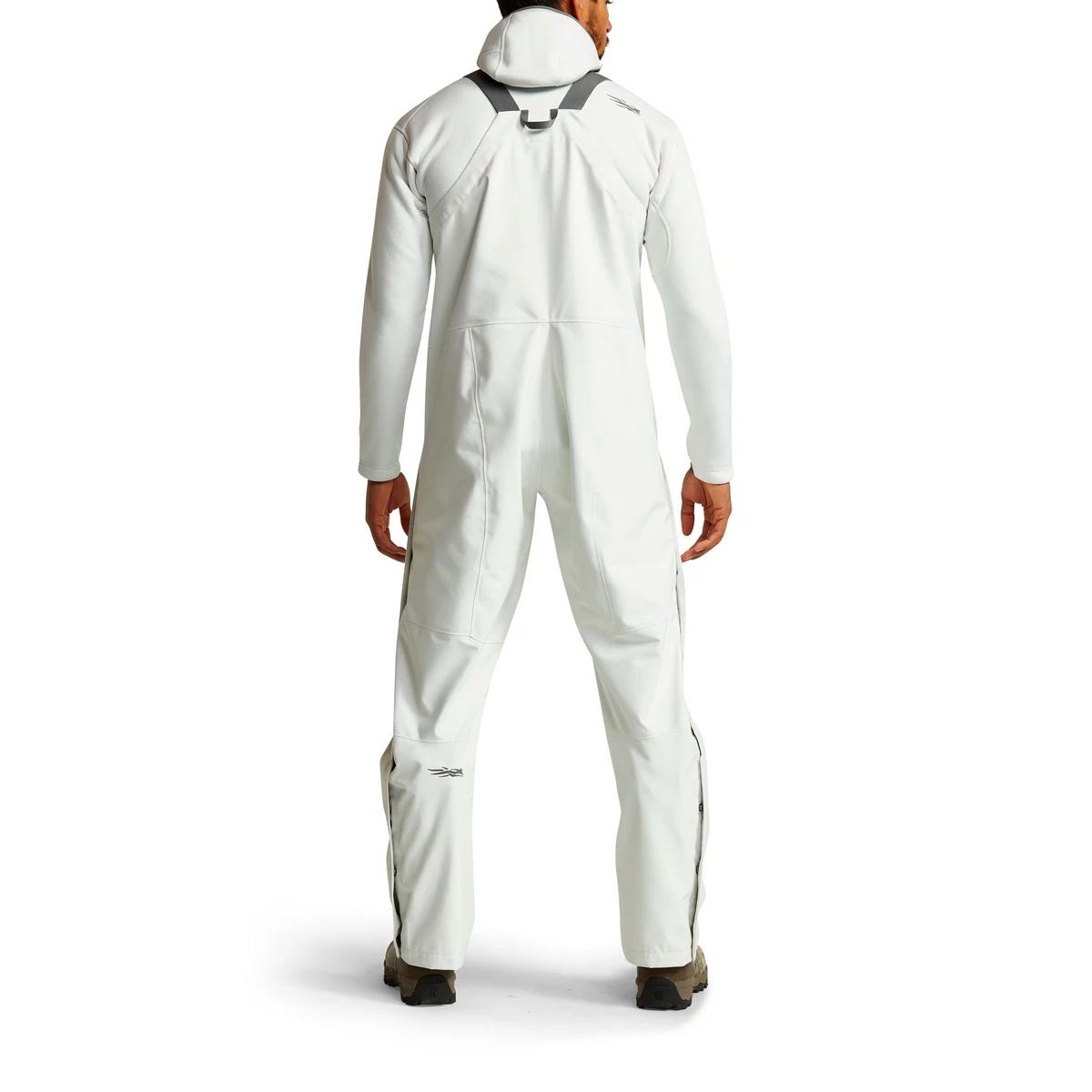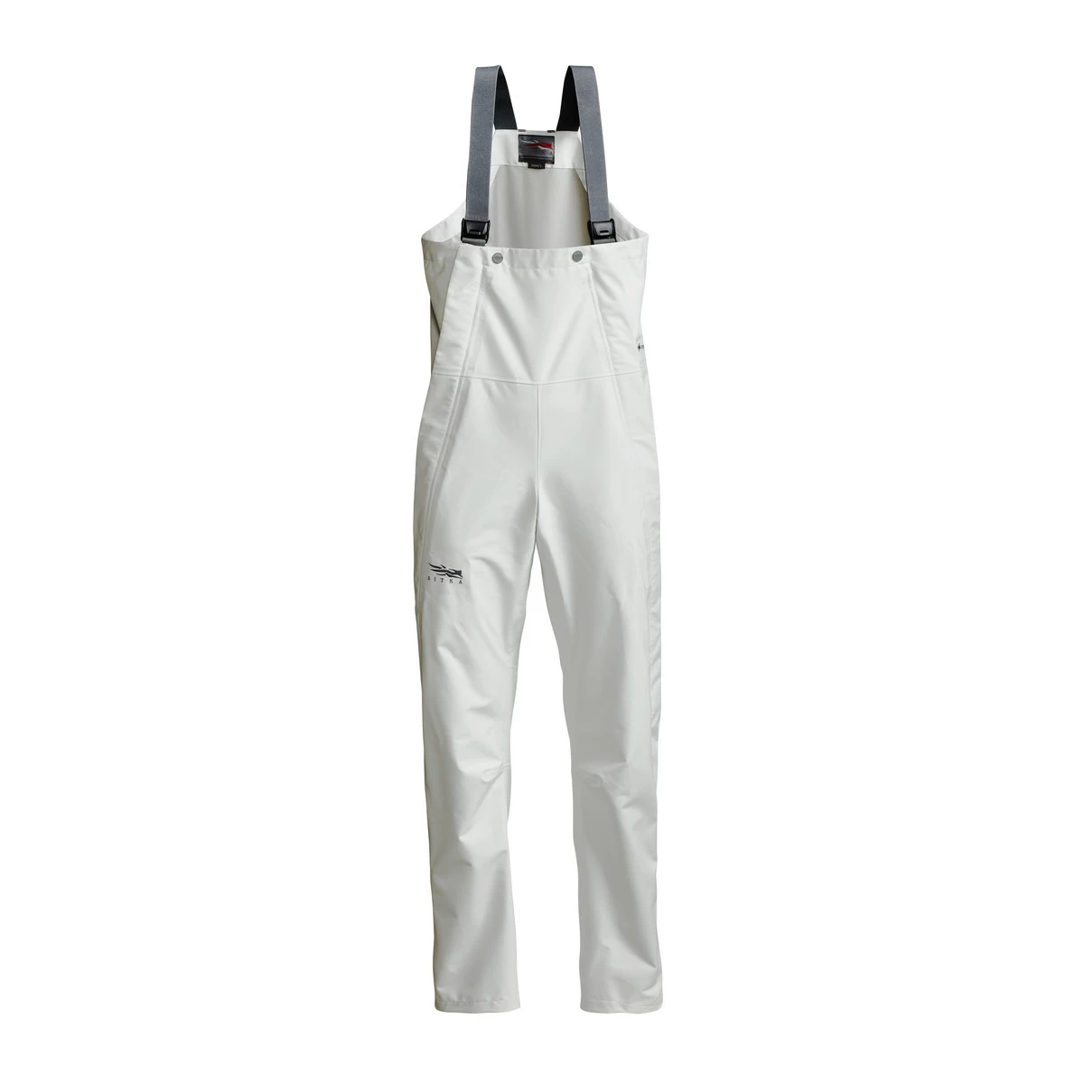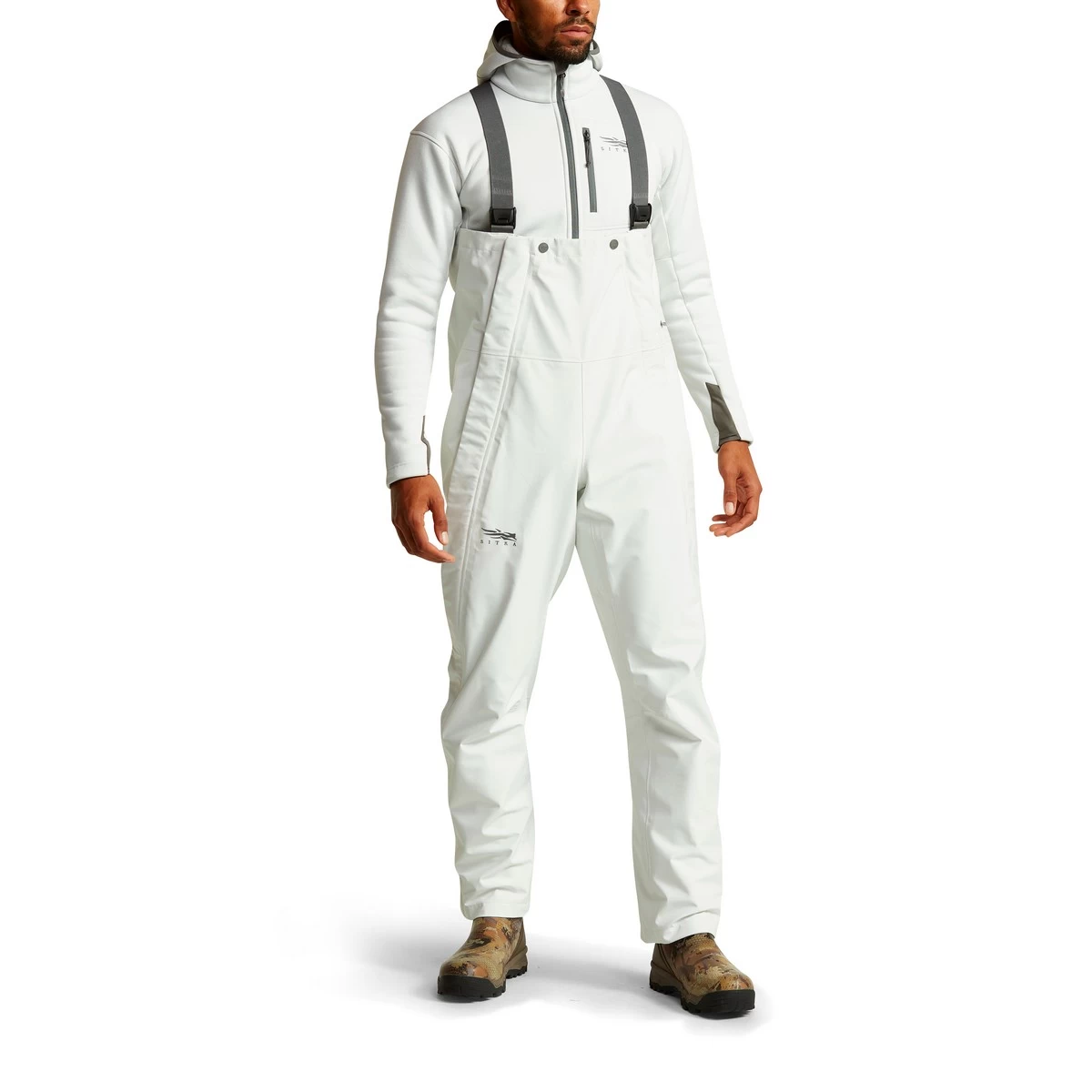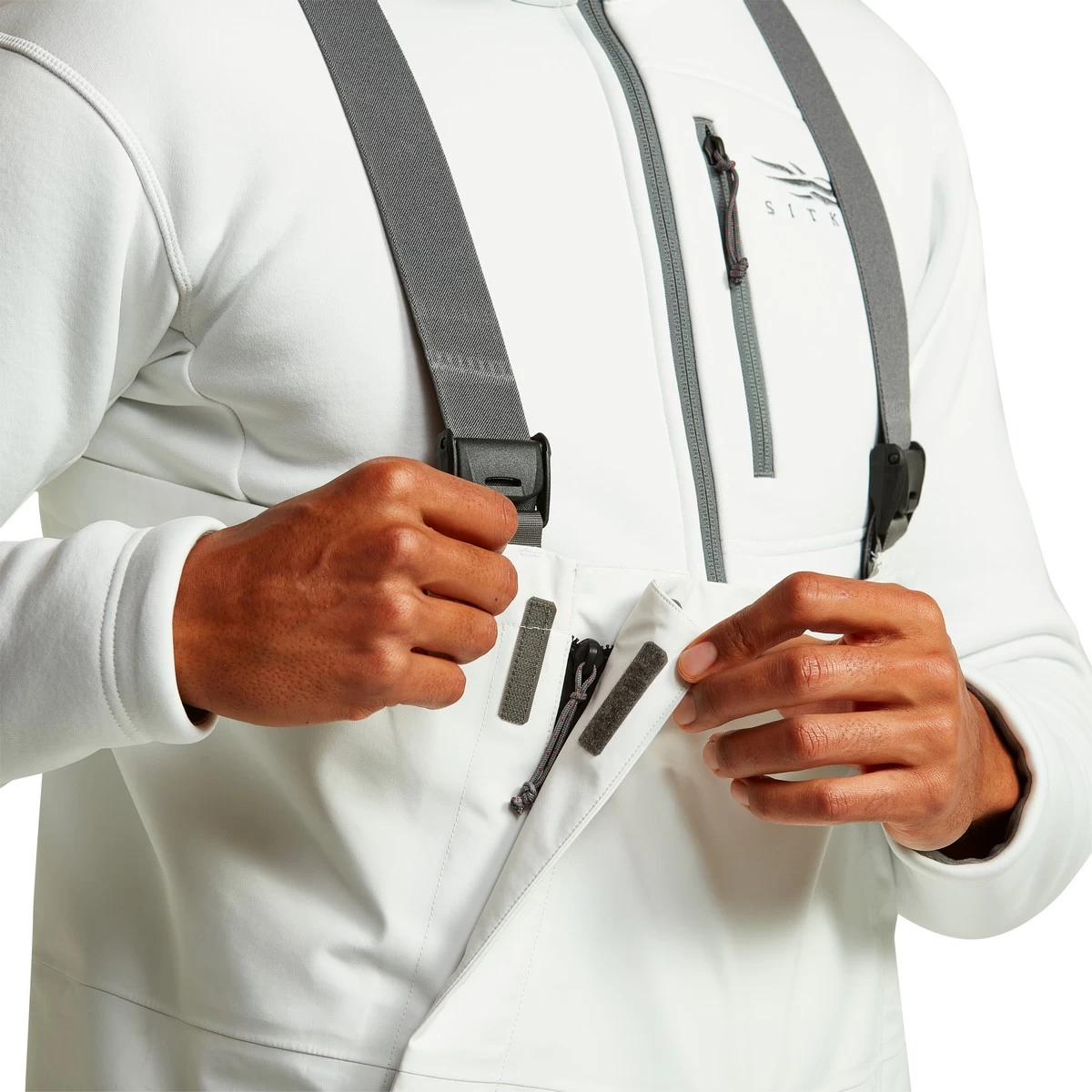 Sitka Nodak BibGear shouldn’t show up in landfills so we designed a long-lasting bib that won’t. Because mud is the main cause of zipper failure, the bib’s venting side zippers have protective flaps and end at the knee where they’re replaced by snaps down to the cuffs. We also worked alongside Gore to create a waterproof/breathable fabric that mimics the color and UV reflectance profile of snow goose feathers so you’re not seen as a threat in the field. The most comfortable whites you can buy, they feature a front-adjustable no-buckle suspension that allows adjustment without hampering the shouldering of your shotgun.Webbing loop on back for hanging/drying. GORE-TEX waterproof/breathable fabric helps you stay comfortable and focused. Non-disposable GORE-TEX 3-layer fabric with 75-denier polyester face and durable water repellent finish. Full-length two-way offset YKK® zippers allow easy on/off, accessing pockets underneath the bib and relief in the field. Articulated Fit with room for layering. Front-adjustable no-buckle suspension allows adjustment without hampering the shouldering of your shotgun. Fabric color conceals by mimicking the color and UV reflectance profile of snow goose feathers. Zipper flaps run the full length of the bib to protect from mud, maximizing durability. Side zippers transition to button snaps at lower leg to limit failure points.